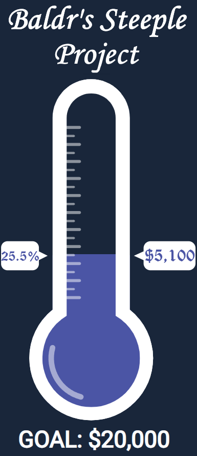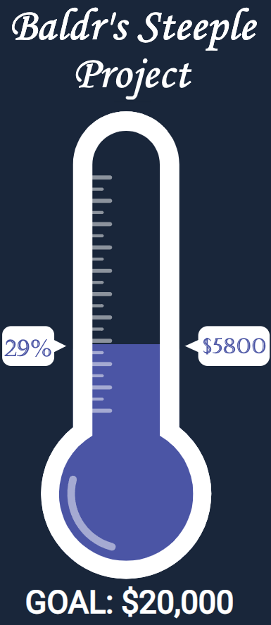 We are starting phase one with a goal of raising $20k for repairs and windows and restoration. Please donate if you can to the Baldr’s Steeple Project! You will be listed as a steeple savior in the hall and helping make Baldrshof beautiful, safe, and shining in honor of the best and brightest of the Gods.